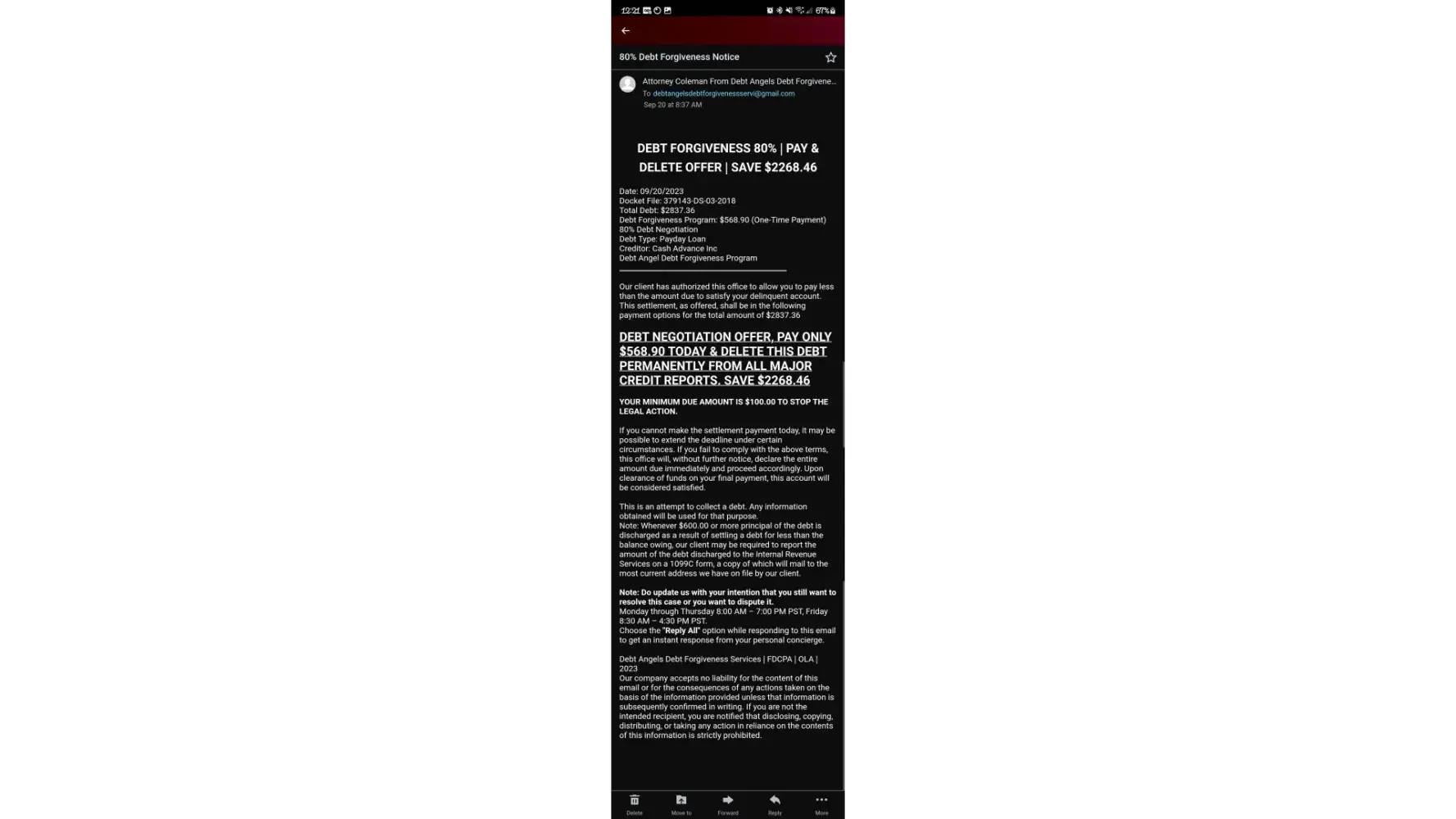 Read full complaintEmail threats and intimidation to pay cash advance