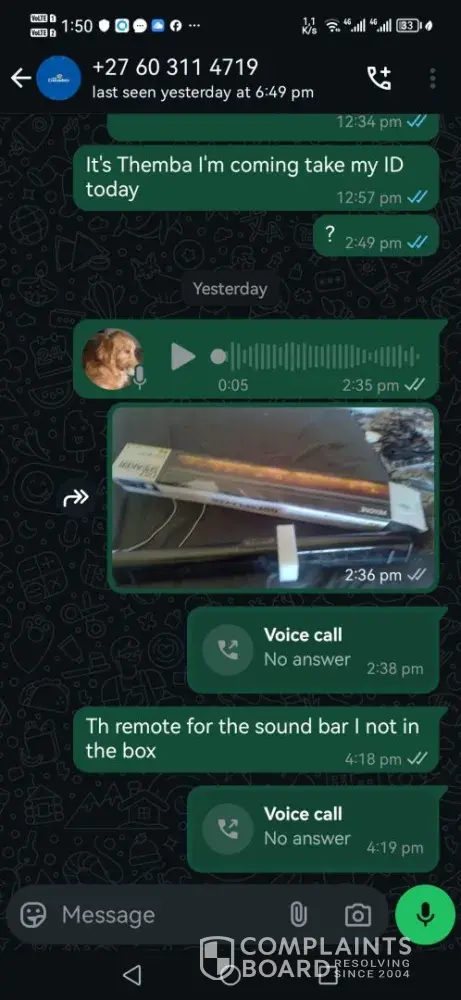 Read full complaintSoundbar/I went to collect my sound at jabulani mall branch and the remote was not in the box