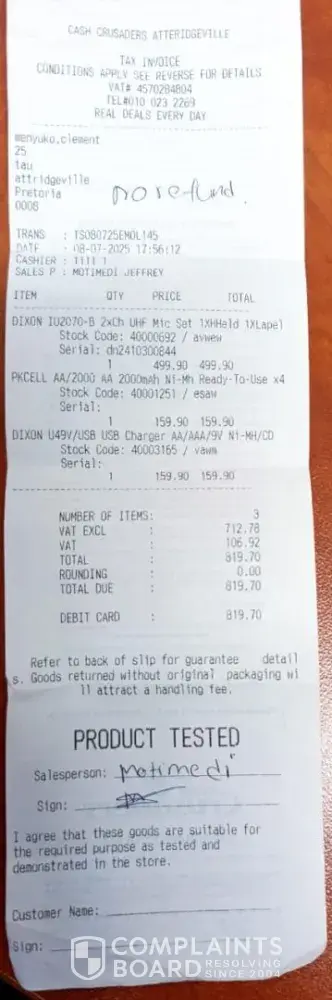 Took my product to Cash Crusaders in Sep 2024, phoned the Hartbeespoort shop to put a hold on my item as it was due. I paid my 1st extension on the 17th of October 2024. 30 days later, I went to make another payment, and was informed that my item was sold. According ro the transaction history, the hold was not on the system, and the repayment date was not...