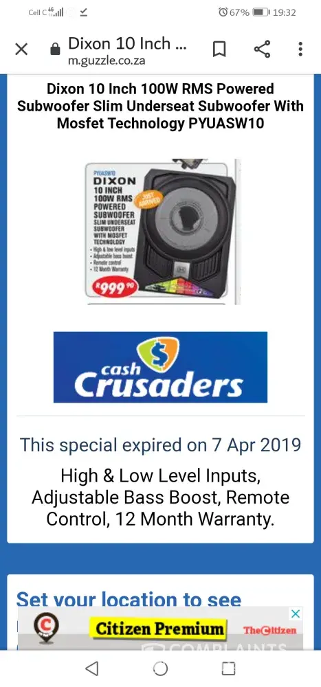 My son bought a a few things at cash crusaders in flamwood klerkdorp branch. I told the sales staff we have a small car so we don't need all the sound anyway my son bought it as he wanted it. He bought it on Monday. 19th.we returned today the 23rd. We never used it it was still in its box but we couldn't get our money back R1099. We had to sell it back to them and got R800. They opened it and tested it not happy the CPA says we have a 7 day cooling period. I'm not happy if I don't get a answer to bad service I'm going to take it further my no [protected].