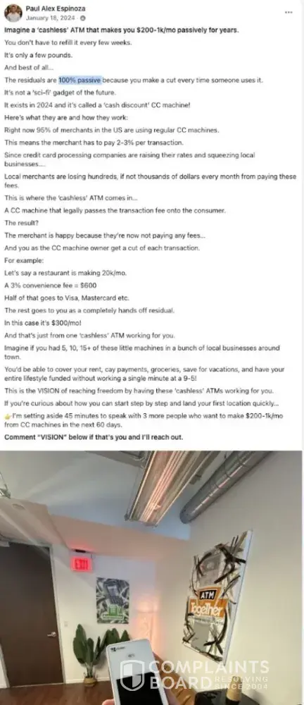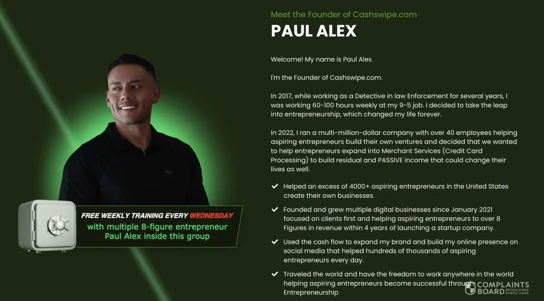 Paul Alex Espinoza (@paulalex, Founder of Cash Swipe), his sales team, and his partners at Paybotx knowingly scam many out of tens of thousands of dollars to this day, selling an elaborate "done-for-you", "100% passive" income business opportunity since 2023. They have systematically deceived people of expected results, incentivized positive review...