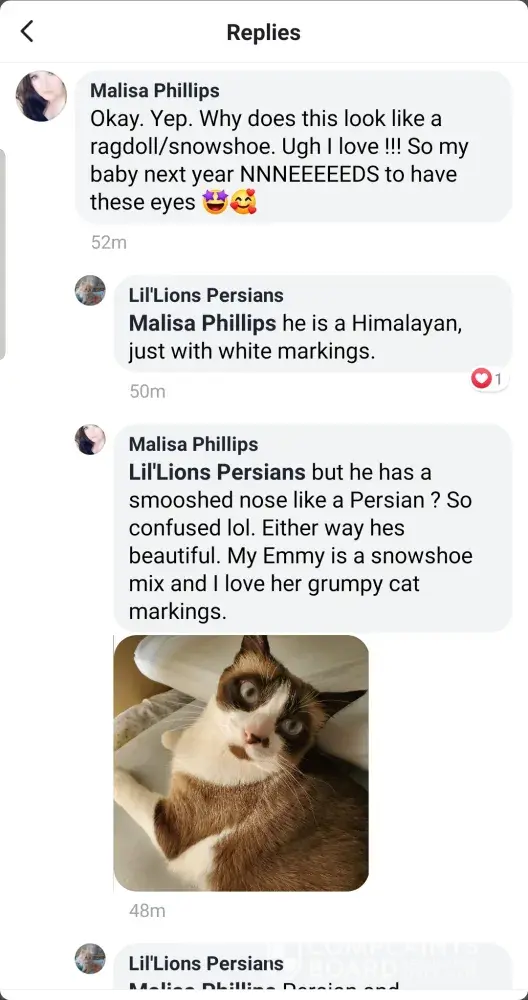 Everyone looking 2 get a purebred persian kitten. beware of people from alabama, mississippi, wisconsin, n louisiana. mixed bred. jessica lovett couch of lil lion persians. she's a very deceiving woman. if you or anyone you know bought a cat from her. look at this. she had 1 ragdoll bred 1 long haired cat. called 1 of the kittens pickles then bred a half...