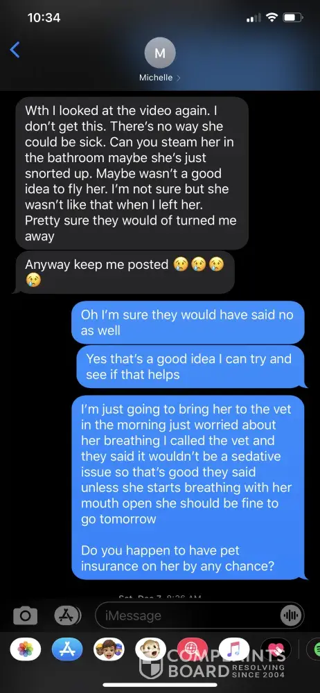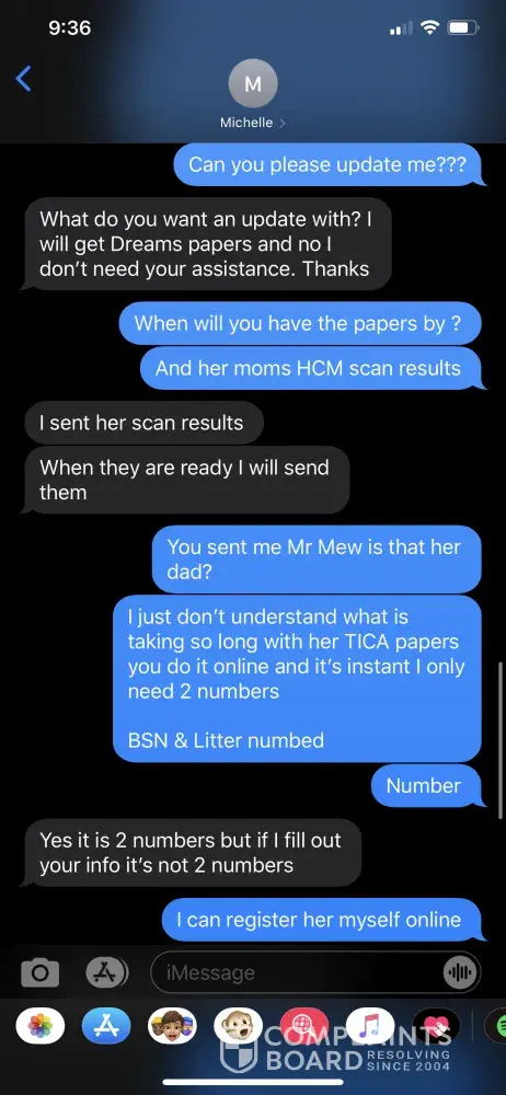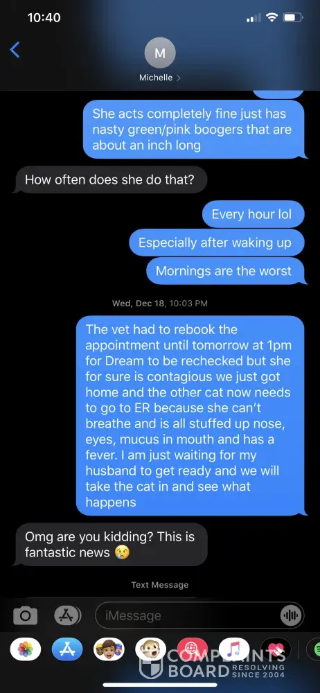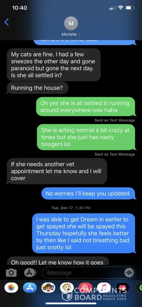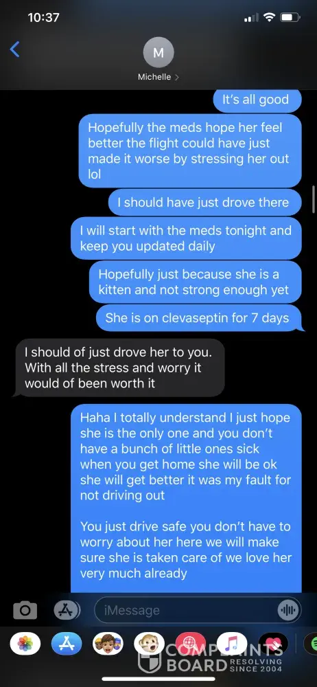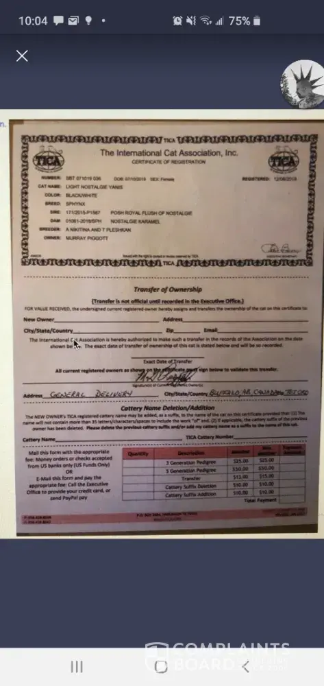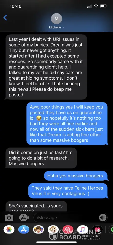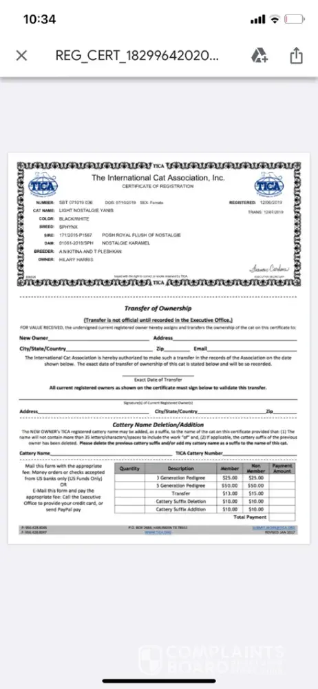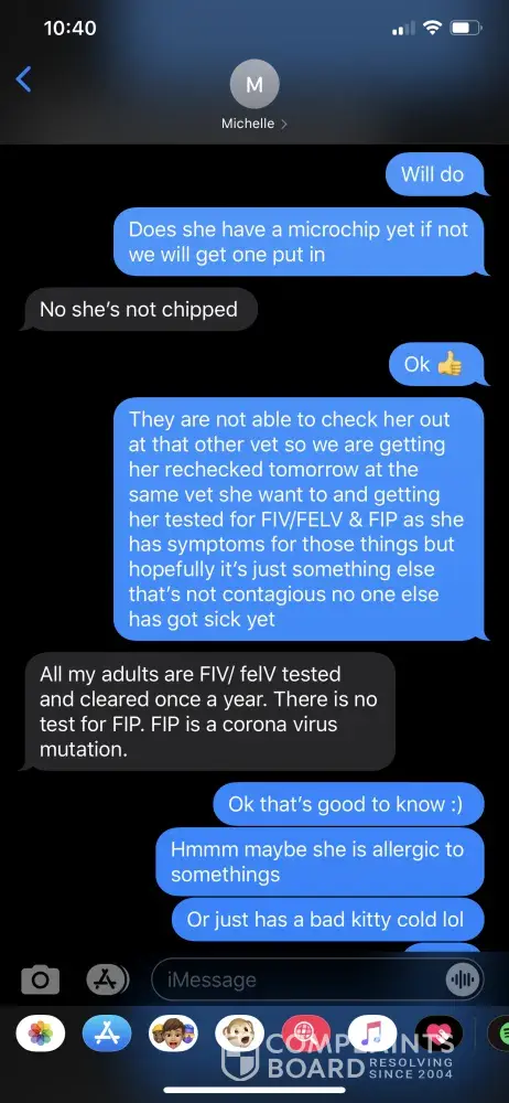 To whom it may concern: I paid fully not knowing that what I paid would be non refundable till after the fact and never paid a deposit which I should have not had to pay the full amount and its been over two months and never contacted me to tell me the situation with the cat, never once contacted me after I paid. I had to contact them. She keeps telling me...