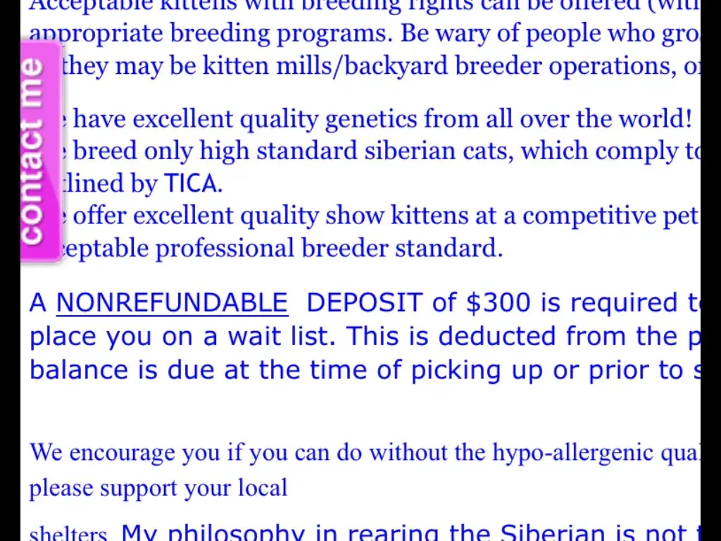 This breeder is arrogant, rude and ignorant, she over charges for these poor kittens, and is exploiting these animals for profit - I simply emailed this breeder to ask if she had any other cheaper options and to please keep me in mind for future litters - she responded with this -( Sorry but I don't take offers on my kittens and all the future litters will...