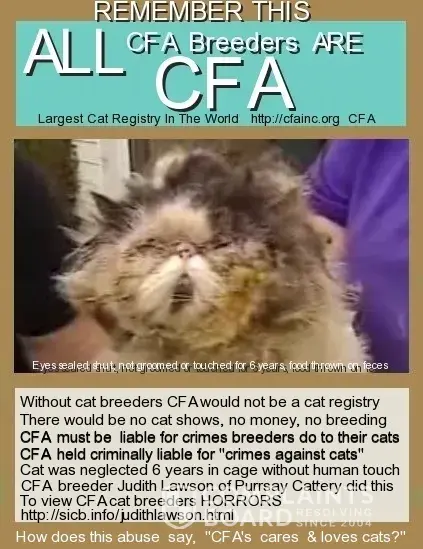 CFA needs to be held criminally liable for THEIR CFA cat breeders doing harm to their own pedigreed cats