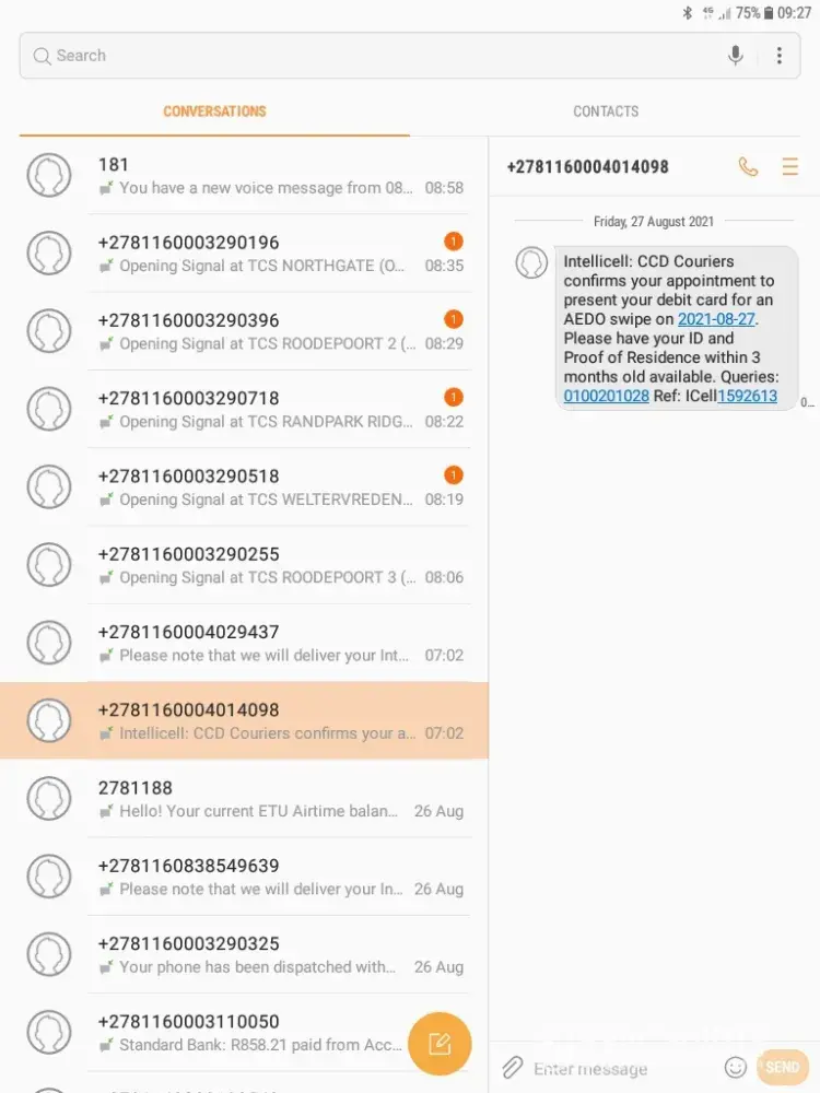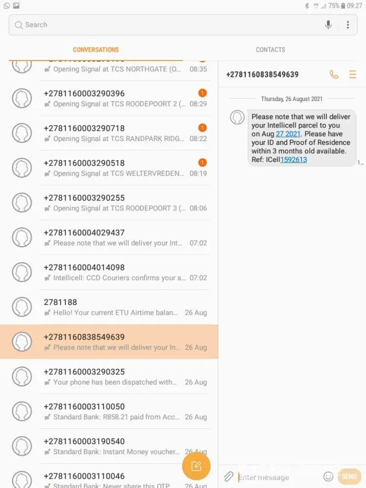 I received an sms from CC D Couriers at 09:34 stating that the couriers is a few minutes away and I should be ready to meet.
