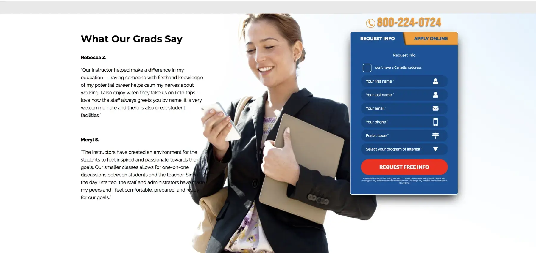 On February 18, 2019, I was looking into schools who offered a paralegal technology program and came across CDI college because they were the first to pop-up on my Google search page (props to their web team for having really good SEO). So I went to their website and there was not much information except for a basic description of the program, a basic "what our grads say" section (which doesn't give much either in terms of credibility. Anyone can easily just slap a quote and a name.) and then they had the little "request info" form that was permanently stuck on the screen no matter where you scroll.