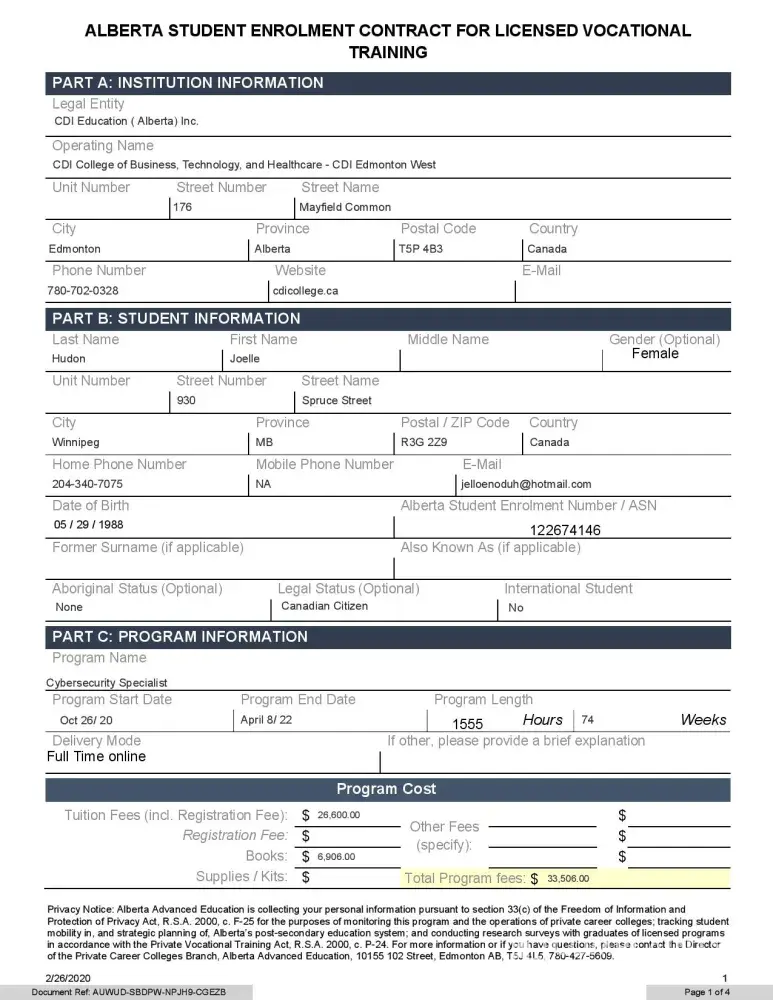 I applied to attend remotely with the CDI Edmonton West and was accepted as a student to study as a Certified Cyber Security Specialist. I then applied for a Manitoba Student Loan and started classes on Oct 26, 2020. When I was enrolled with CDI, I was assured the amount that they asked for in costs were provided to both myself and Manitoba Student Loans (see attachment). While attending classes, there would be online labs that students would attend however, the instructor would allow a student to take over the class, confusing many of us and it became disheartening and frustrating. I sent a complaint and was assured that my grades would not reflect the interruptions, but it interfered with my learning process. I was unable to utilize the online classes and labs for many of my courses due to links not working or not being available. This also includes classes that were spent having an instructor reading from an eBook, that was already read by the students prior to class as well as lectures were supposed to be downloadable however, were not.