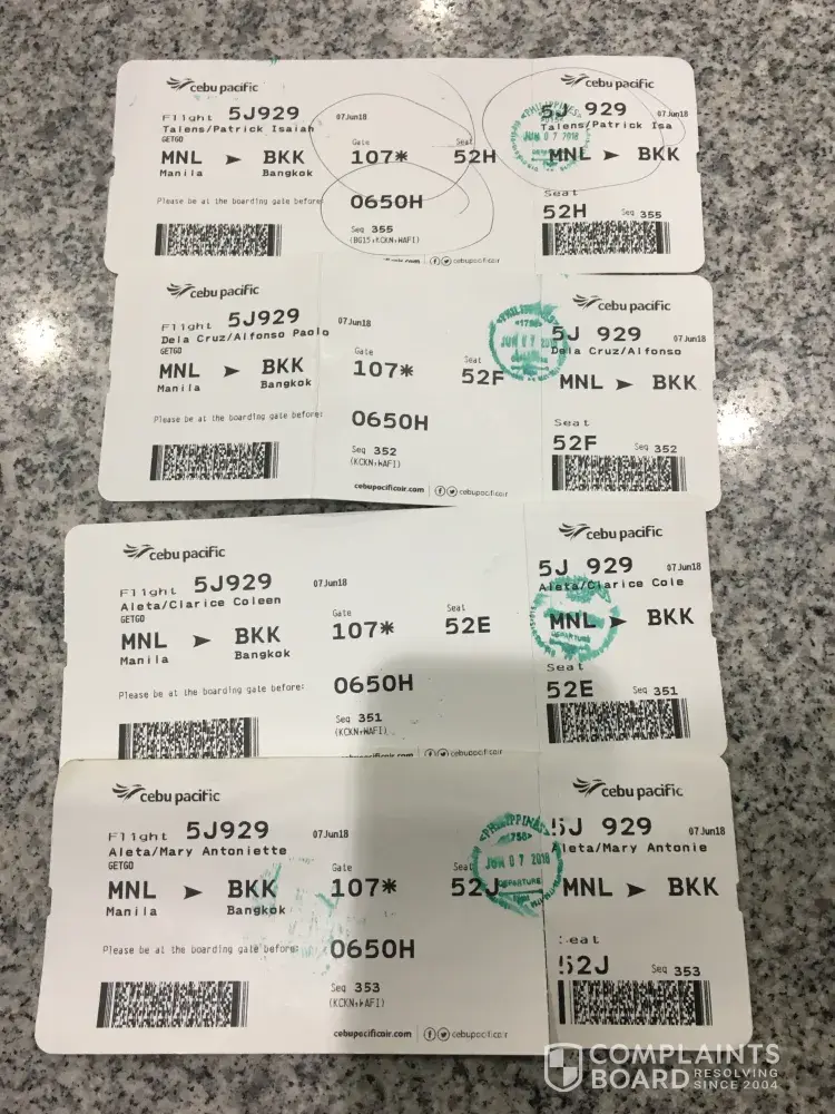 We had reserve four plane seats online (27A, B, C and D) but we were allocated to different seats (52E, F, H and J) at the time of our outbound departure (flight no. 5J929) to Bangkok, Thailand. We would like to request for a refund of the seat reservation we paid for. Our booking code is XDN5KZ.