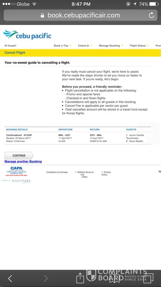 I have made booking online from Cebu Pacific last April 13, 2017.