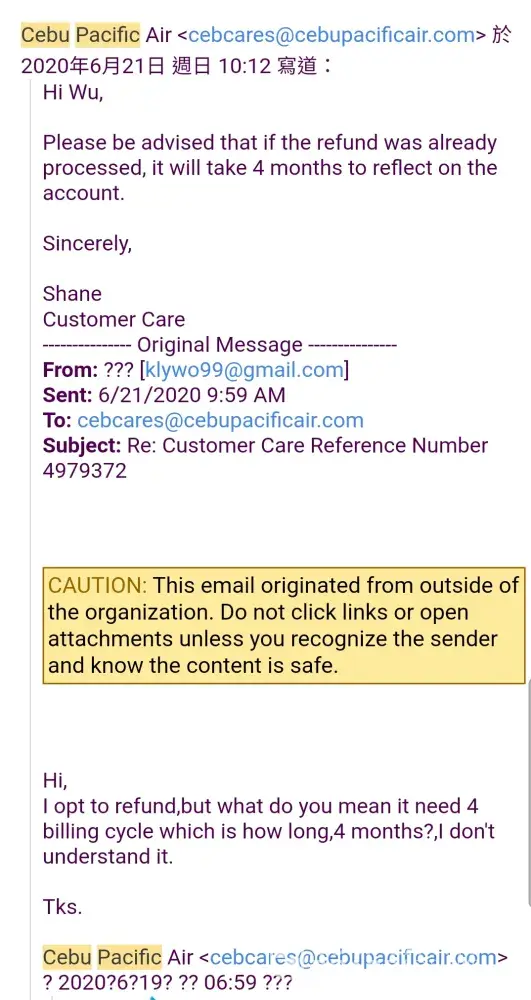 Cebu Pacific customer service is no longer responding to my refund request for booking FEECMZ. I first submitted an application for refund last year (July 2020). I've been very patient whenever they tell me the process has not yet been completed. Around October 2021 I asked for another follow-up & they asked for one of the passenger's birth certificate. I have them a heads up that it might take me a few days to submit a copy of the birth certificate since I have lost it. They were very gracious about it. But once I did submit a copy, they no longer respond to my many emails. My Customer Care Reference Number is 4901106.