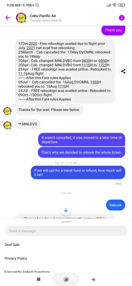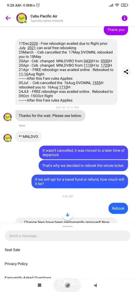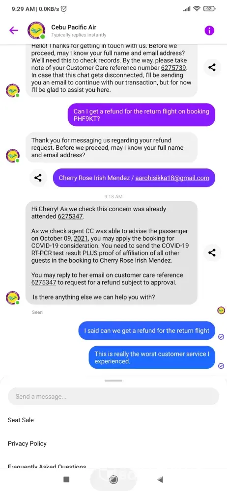 Worst customer service ever. Last night I did seek help from their CS via messenger chat because we've missed our flight yesterday due to pandemic reasons. The agent who's name CC did not get back to me, not even properly ended the chat. Same with James whom I chatted today. I am only asking if we can have the return flight be refunded and yet they're giving me hard time. Worst and unprofessional customer service.