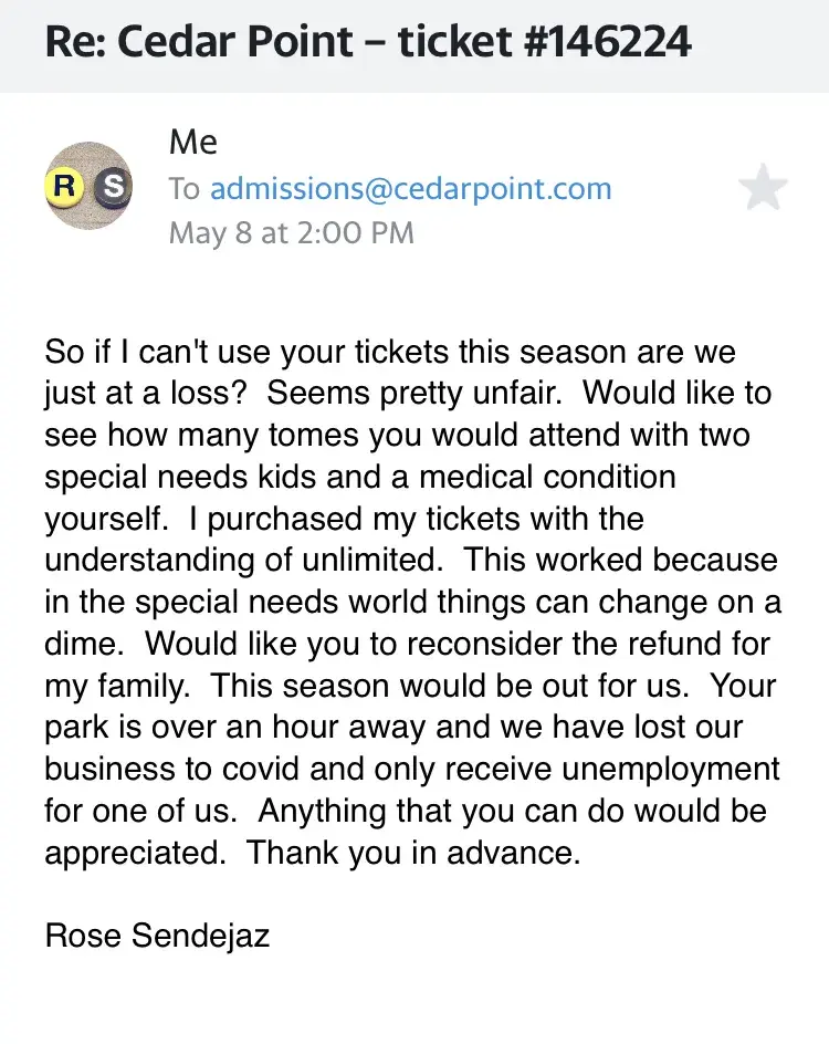 Desired outcome: Would still prefer a refund or at the minimum to extend the passes to the 2022 season.