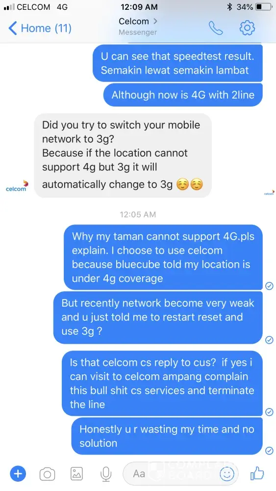 I recommend all my friends and family members to support celcom. Now currently your network speed very weak. I make a complaint and aspect ur improvement. U asked me speedtest many times, but u r not believe the results, only know to told me reset network, restart phone and lastly u really make me mad > is that celcom cs always asked your cus change network to 3g to solve the network failure problem