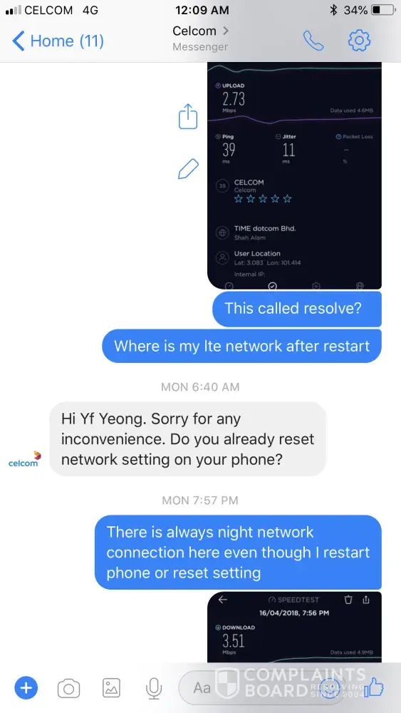 Saya pengguna celcom pospaid telah membuat aduan mengenai masalah rangkaian yang sering hilang yang berlaku selang 3minit di semasa menggunakan data..Apabila aduan dibuat feedback akan dihantar yang mengatakan masalah telah diselesaikan dan selang beberapa minggu masalah yang sama berulang..Apakah perlu aduan dibuat sepanjang minggu?Mohon Tindakan.