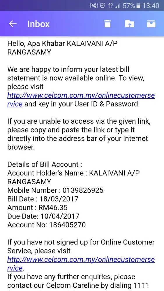 FYI. I have settle my phone bill by auto debit to my credit card, and before inactive my phone line I have clear all my outstanding and now how come celcom can me such information some she keep on mentioned Cik Iza already resigned.