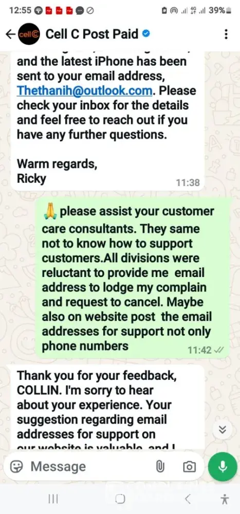 Good day, I hope this message finds you well. I am writing to express my deep frustration with the service we have received from Cell C. We were informed that our query would be addressed within 72 hours, but this timeframe has long passed since we logged our request. We urgently need the lawyer's contact details to resolve this issue. We need an answer...