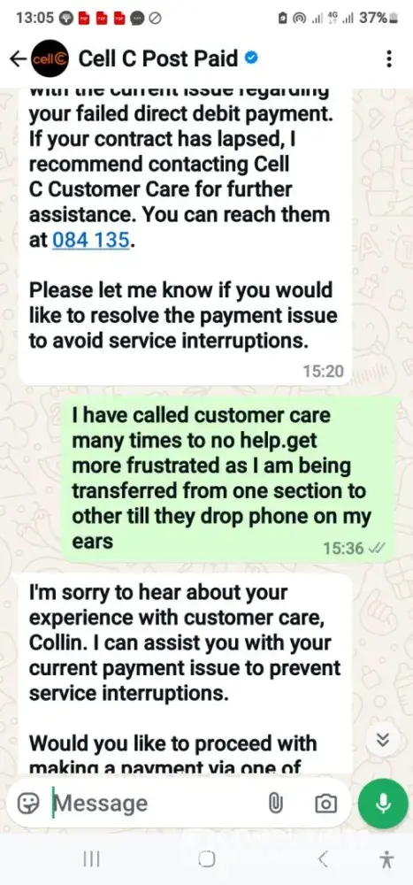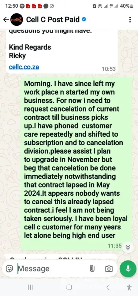 I find myself deeply frustrated with CellC's service as my ongoing query remains unresolved. Despite the lack of a resolution, I'm being prompted to evaluate the quality of their service. Unfortunately, communicating with their call center has proven unproductive. They appear unwilling to listen, offering only vague assurances and insisting that I must wait, with no specific details about the status in the back office. This situation has left me with no option but to escalate the matter further through avenues such as the Ombudsman, NCC, and ICasa. Despite being a loyal customer for many years, the lack of responsiveness is pushing me towards considering cancelation and exploring alternative service providers.