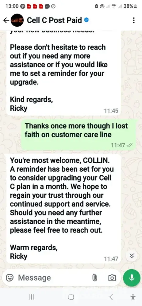 I am writing to express my significant dissatisfaction with the service I have received from Cell C. As a long-standing customer for 16 years and a Vodacom manager, I am disheartened by the numerous issues I have encountered recently. On Tuesday, February 4, 2025, I was contacted by one of your upgrade consultants, who informed me that my lines were due...