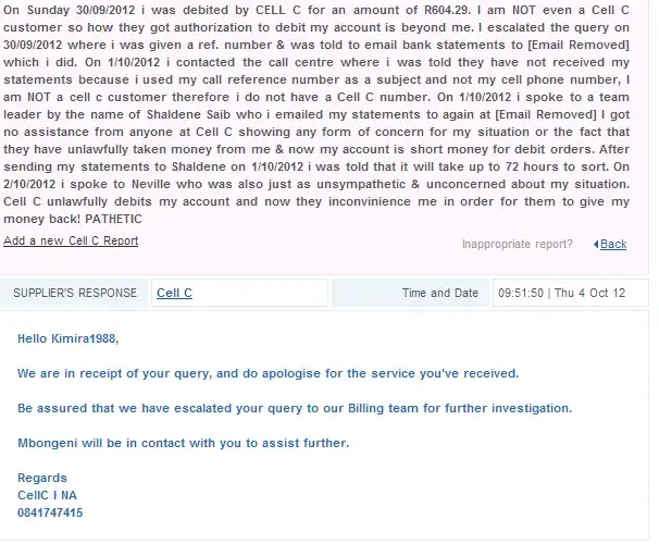 Complaint 2: I have gone into the 3rd week of empty promised from cell c. After my initial query logged on 30/09/2012 I have been in contact with many cell c customer care agents and team leaders. I was promised that full refund will be in my account on 15/10/2012 and I still haven't received anything. Mbongeni ntshangase from cell c is now no longer replying to my emails and I have had no further correspondence from cell c. This is appalling. It looks like cell c will gain the profit of my r604.29 that they debited from an bank account that belongs to someone who doesn't even have a cell c contract. I have been in tears trying to sort this out. The financial strain it has put on me and the problems it is causing at work for me to be on the phone all the time to get answers from cell c. The service provider doesn't care about the customer whether they belong to cell c or not nor do they care about the urgency of the matter when taking money from someone they had no authorization from. This matter was internal and was a fault at cell c now I am suffering for their incompetence. Flipping useless people at cell c! Can not believe that no one can help me after stealing my money