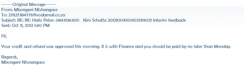 I have changed banks and all corresponding documents have been submitted to mbongeni ntshangase at cell c. He advised my new banking details have been loaded for refund and that I would have payment from cell c no later than monday 15 october. It is now tuesday 16 october. Mbongeni is ignoring my emails and no one at cell c can tell me what is going on.