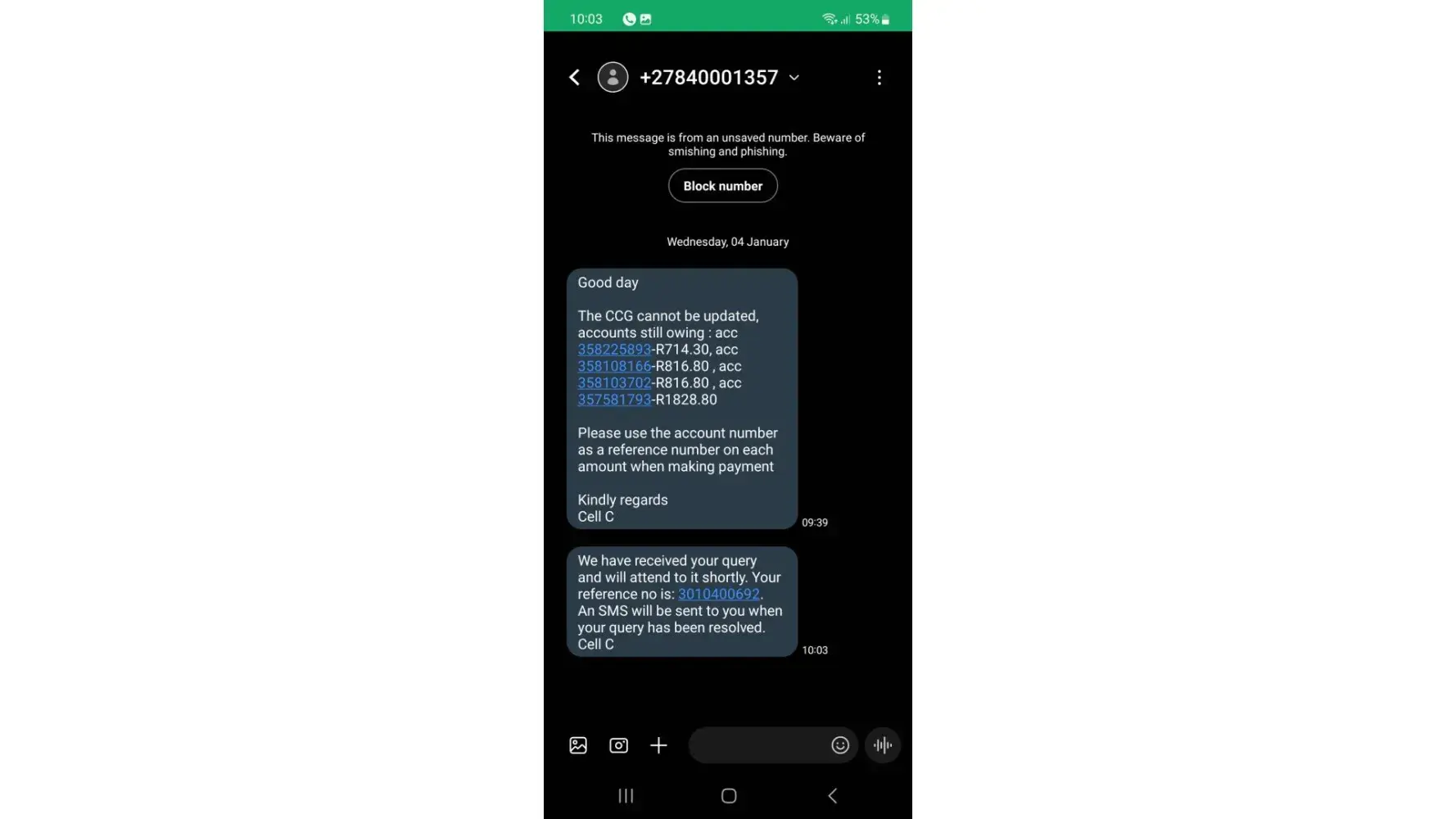 In the meantime I have received an SMS from Cell C urging me to make payment or services will be suspended.