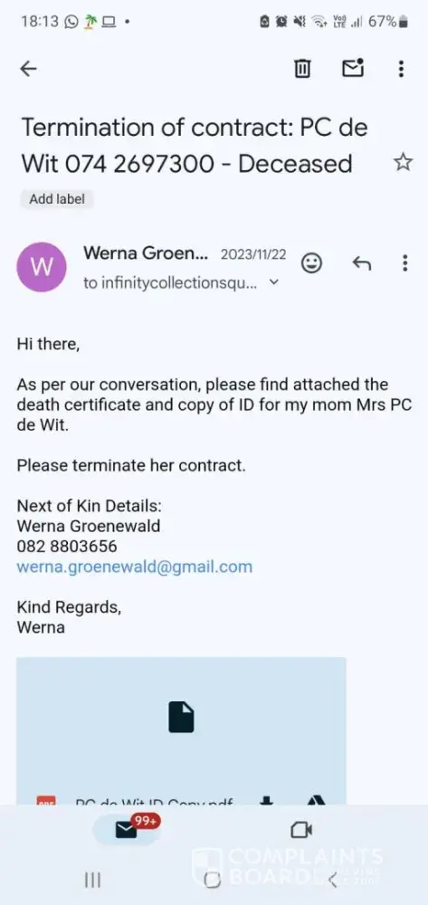 My mother (Mrs PC de Wit, ID number [protected]) passed away 14 November 2023. I contacted Cell C to ask for the process to report and close her account whereby I was informed to email her death certificate and copy of her ID to [protected]@cellc.co.za, which I did on 22 November 2023. I have followed up by phone, where I was referred to a branch. I went to the branch and submitted all the documentation again and still to date the account is active and the debit order is collected every month. Can someone please assist in closing her contract [protected]) and refunding the debit orders that has been collected since her passing?