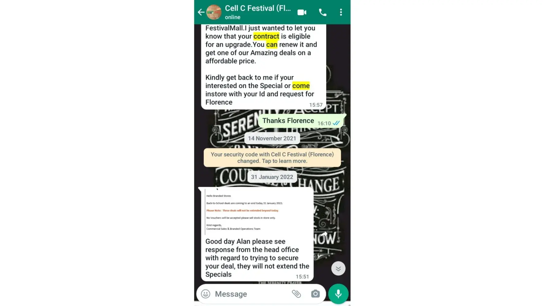 On 31/02/2022 Florence abrubtly forwarded a message to me purportedly from head office. In a nutshell it says that deals will not be extended. (See attached)