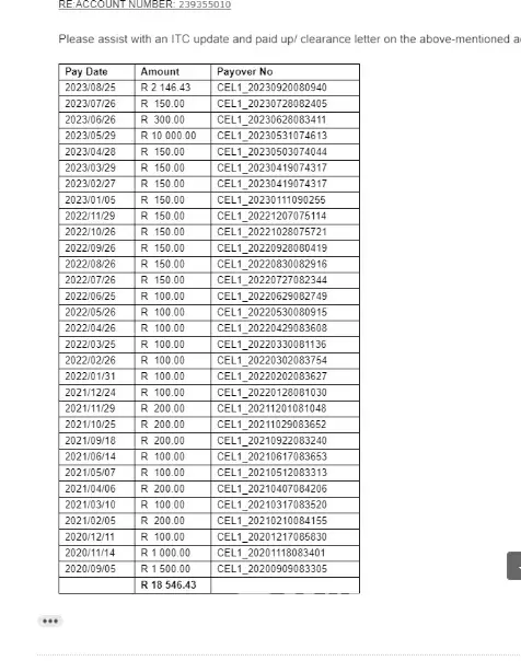 2020 I was retrenched, couldn't pay my account, I was then handed over to Shapiro Sheiks, I made arrangements, I tried to paid whatever I can afford, I got a job in 2021 where I started paying even though it wasn't much but I tried as I am a single parent, 2023 which is this year paid the full amount on the 18 September 2023 and sent the prove of payment to Shapiro sheiks, Lawyers requested for the paid up letter as I paid the amount in full, cell c keep on saying I am owing even if the lawyers insist that I paid in full.
