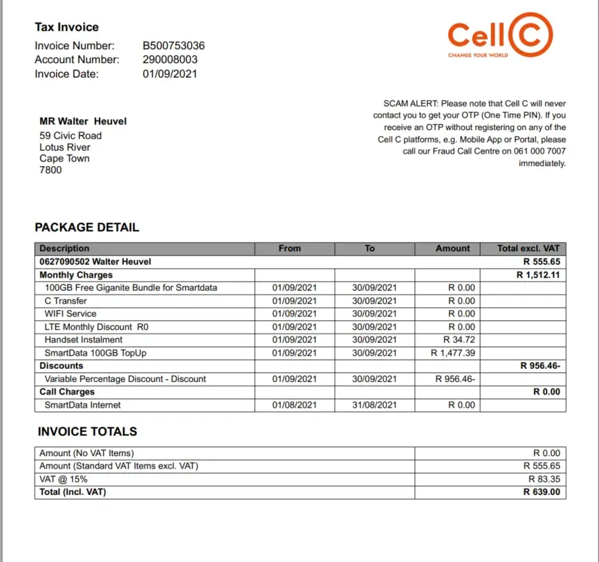 Phoned Cell C on the 2nd, 6th and 7th of September to enquire about the messages I received (Kindly note that your Cell C account of R1295.94 is in arrears. To avoid service interruptions, please call 084135 urgently to arrange payment)