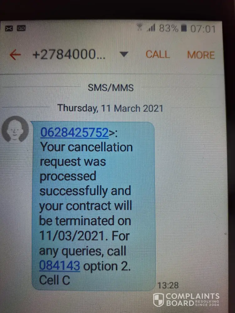 Kindly see attached SMS from Cell C cancelation department dated 11 March 2021 after my conversation finalizing the contract termination telephonically for data SIM [protected].
