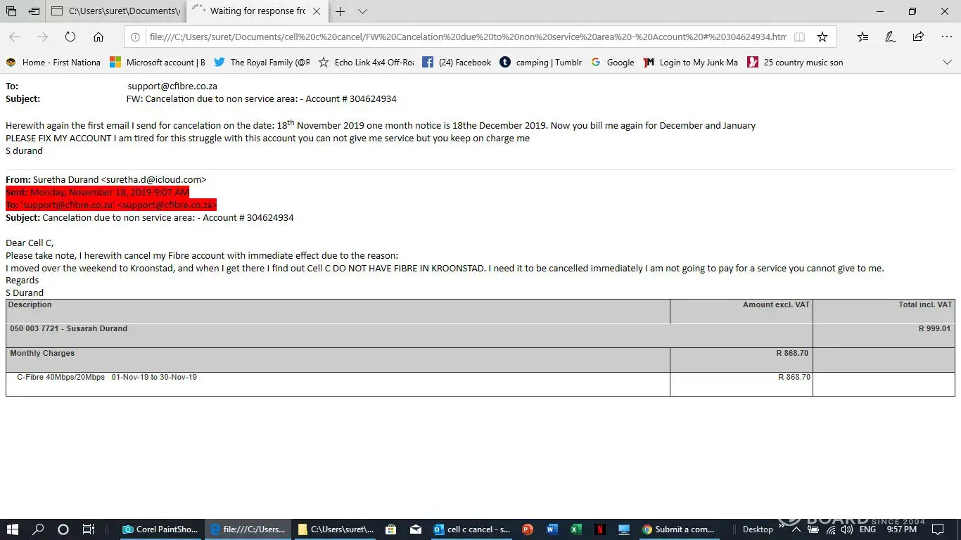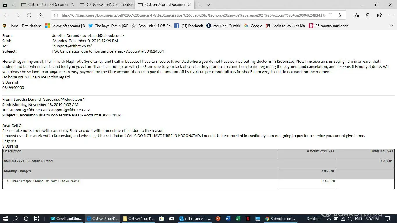 I have a contract with them but fell ill and move then to Kroonstad to be near my doughter and the doctor. Kroonstad do not have Cell C Fibre they can not give me service but they keep on charging me for a cervice they can not deliver. On the 18the November I send them a email for cancelation but it is not done. Herewith all email I send to them. PLEAQSE help in this regard, I do not help to talk to tehm