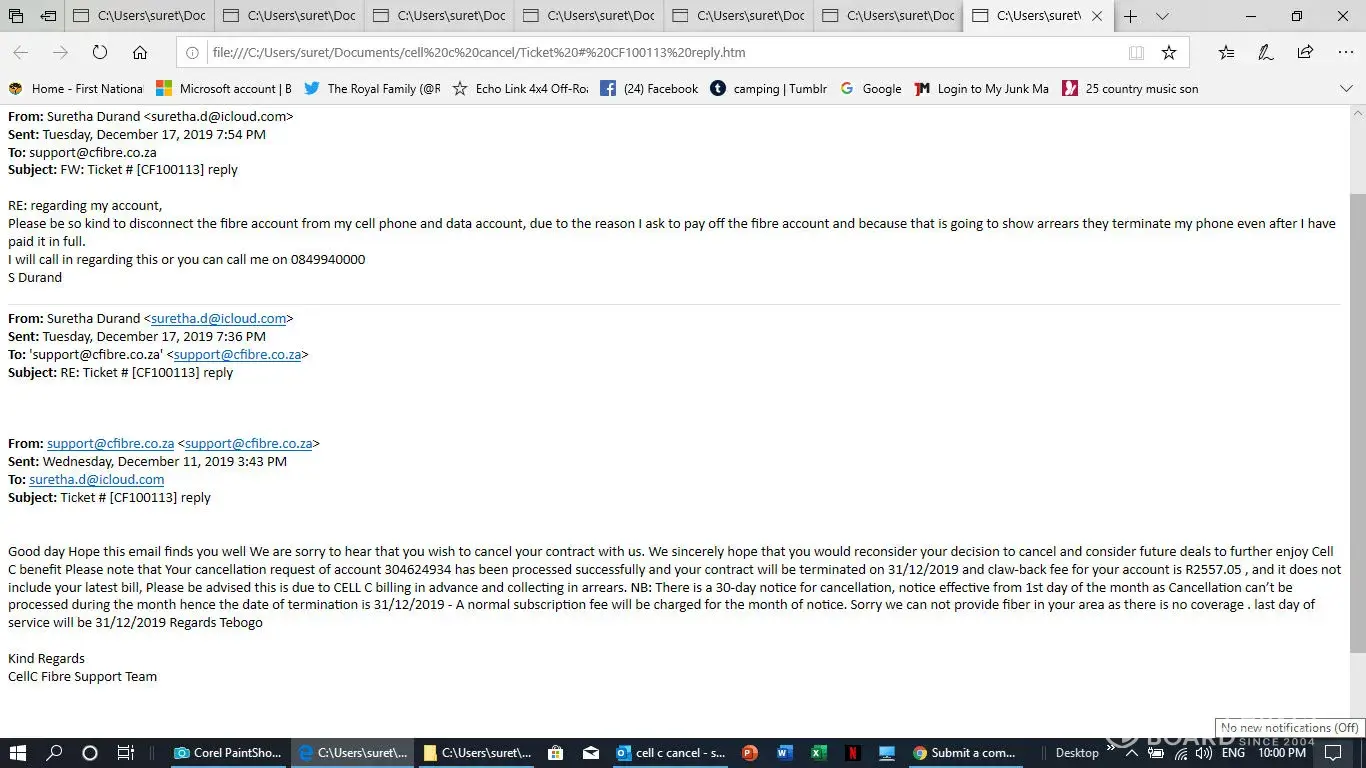 Herewith all emails I send to Cell c for cancellation and still they charge me