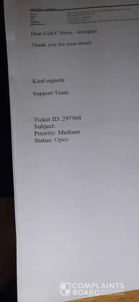 My phone submitted 20 July 2019 up till to date I still have no feedback when phone will be sorted. I'm bekah told on different occasions going there and phoning next week of things 7 days insurance lost ticket for repairs then it's some other issues .I have had with cell c I will no longer like to deal with cell c .ticket no attached .I'm writing to hello Peter as I'm writing to you so well.its disgusting to take all this time and not able to answer. It's either u give me a new phone or givey phone back before 15 November 2019