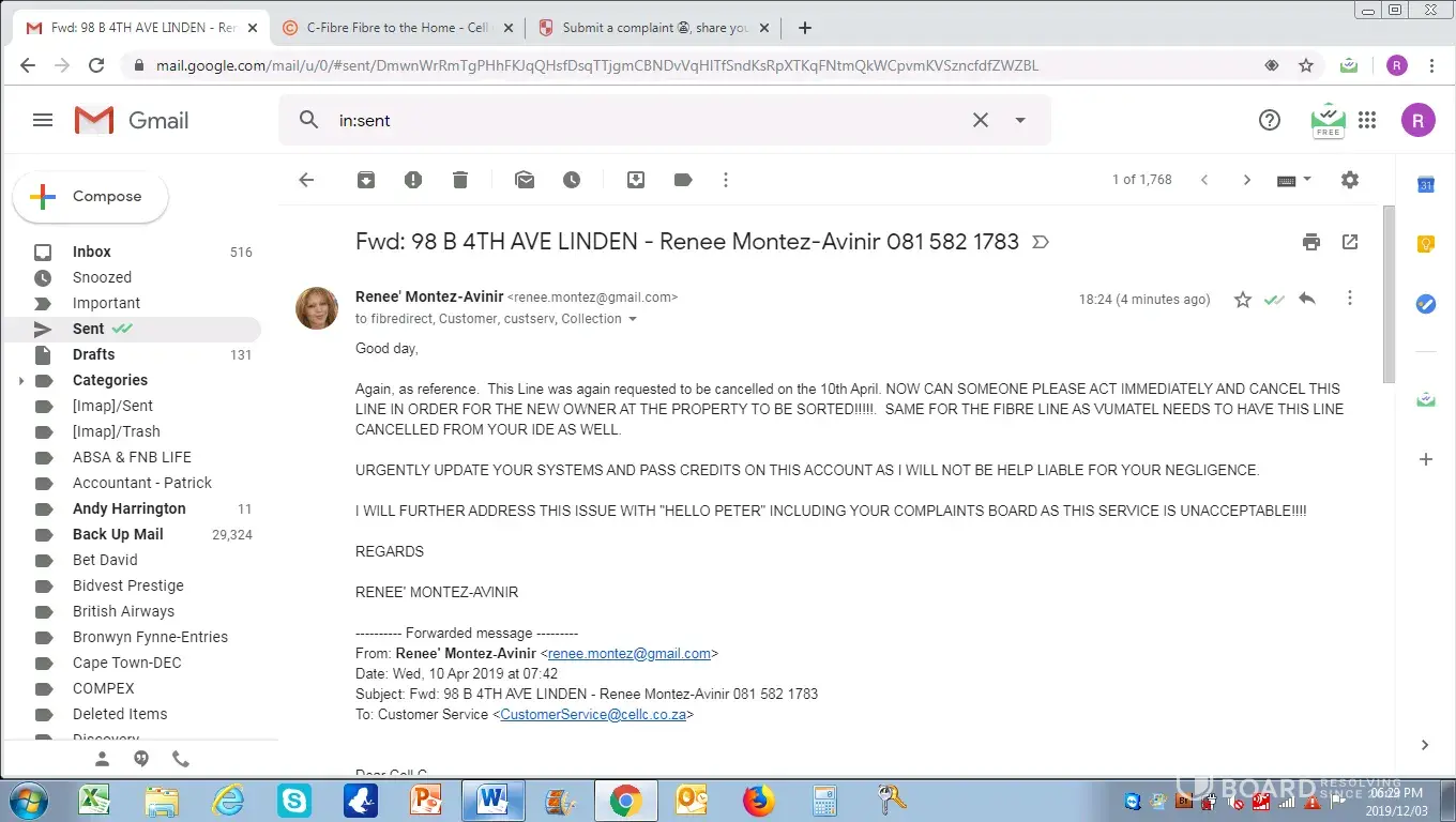 Good day, This line has been cancelled on the 31st March as I have relocated!. The new owner in that property just contacted me as she can't seem to connect, due to Cell C who never cancelled my line. Please note that I need to be credited on this line as the request to cancel the line was sent through several times. I will not accept any billing for this negligence on your side. Please urgently have this line Cancelled account number [protected] ID: [protected]