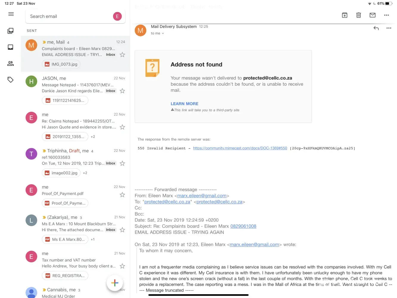 Firstly it was stolen in Ster Kinekor in Mall of Africa. I went straight to the Cell C branch to report. They asked for a police statement and they had it on their desks the day after. I was informed that I would need to wait for the replacement for about 14 working days. I had to buy a cheap replacement as no loan phones were supplied if client claimed from insurance. I work from my phone and needless to say it was a mess. I called the branch a day before agreed collection to confirm and they only then reached out to the insurance business to realise nothing has been done about my claim as the SAPS case information was missing. I filled in a claim form with the number and details when I submitted the claim. The SAPS case was attached to the claim. How did this happen? I needed to use the "Hurricane" replacement I bought at the Cell C store for another while due to "pathetic" process and services. I got my phone after a long wait and I did not make a big scene about this.