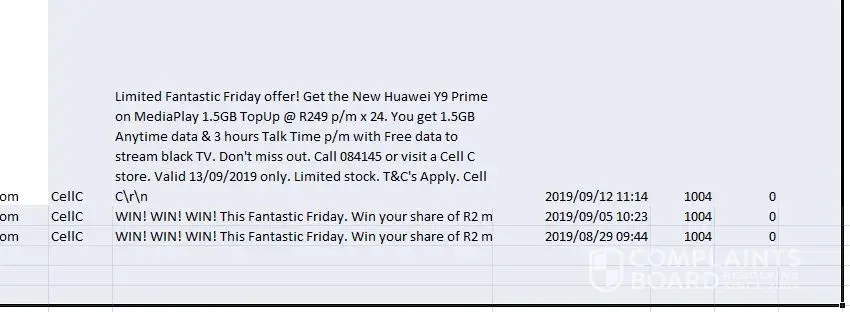 On 12/09/2019 I received a SMS message from CellC promising me a deal on a Hauwei Y9 Prime for R249. It promised me 1.5g of data as well as 3 hrs call time. This deal was valid for Friday 13th only.