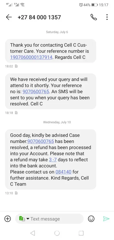 Here is the reference for the refund which was never taken off my account and according to cell c im still in arrears i get pestered for the outstanding amount