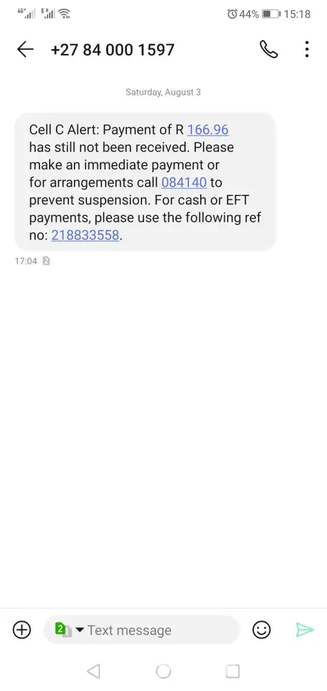 Cell C Alert: Payment of R 166.96 has still not been received. Please make an immediate payment or for arrangements call 084140 to prevent suspension. For cash or EFT payments, please use the following ref no: [protected].