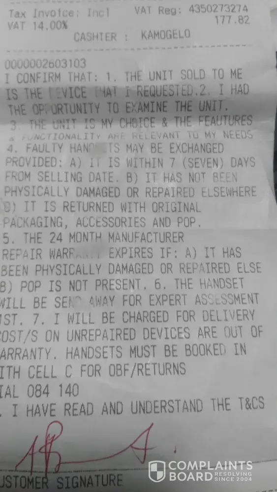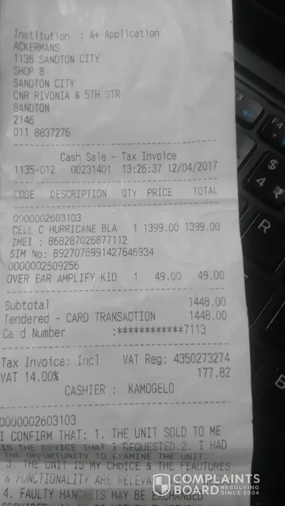 We handed in my Hurricane Blast for repairs at Ackermans on the 9th May 2018. We were informed by Cell C repairs department that our warranty has expired. My tax invoice indicate that I have a 24 month manufacturer warranty. I purchased the tablet on the 12th April 2017. The Cell C repair department said that I must take this up with Ackermans because they only have a 12 month warranty.