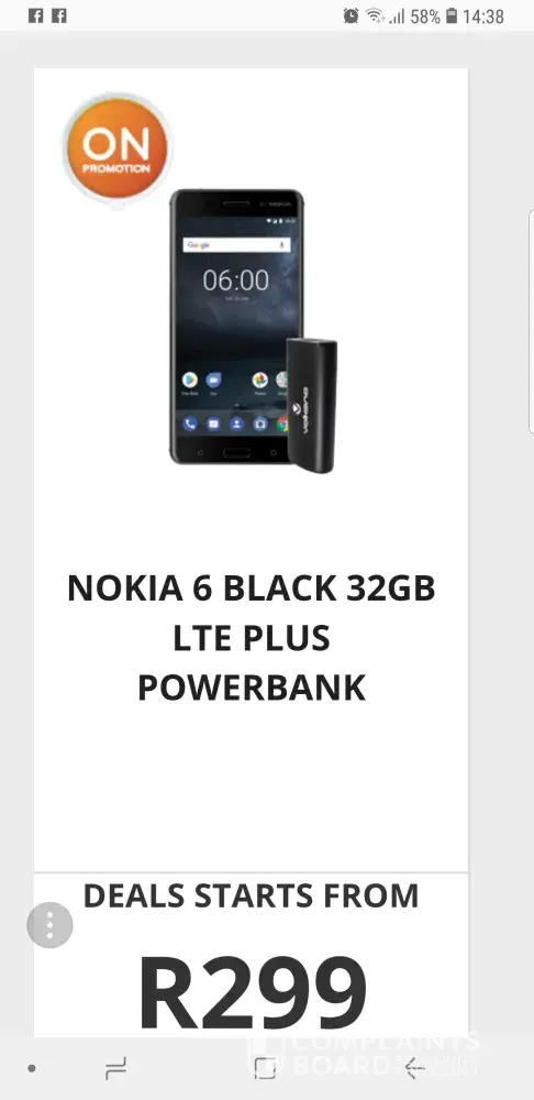 Good day, I was due for an upgrade now in May and I have done this via internet. The call centre called me and I spoke to Guy from the call centre on Friday, 04/05/2018 for a Nokia 6 PLUS Power bank, because it's their special now. He also said my my new repayment will be R319 included, 100 sms'e, 100 minutes and 100 data. So, yesterday, 08/05/2018 I got the phone but without the Power bank? so I called them and asked, a lady by the name of Gwen said the phone dont go with a Power bank anymore and I told her they need to come and get the phone because I dont want it anymore, I want the phone with the Power bank!