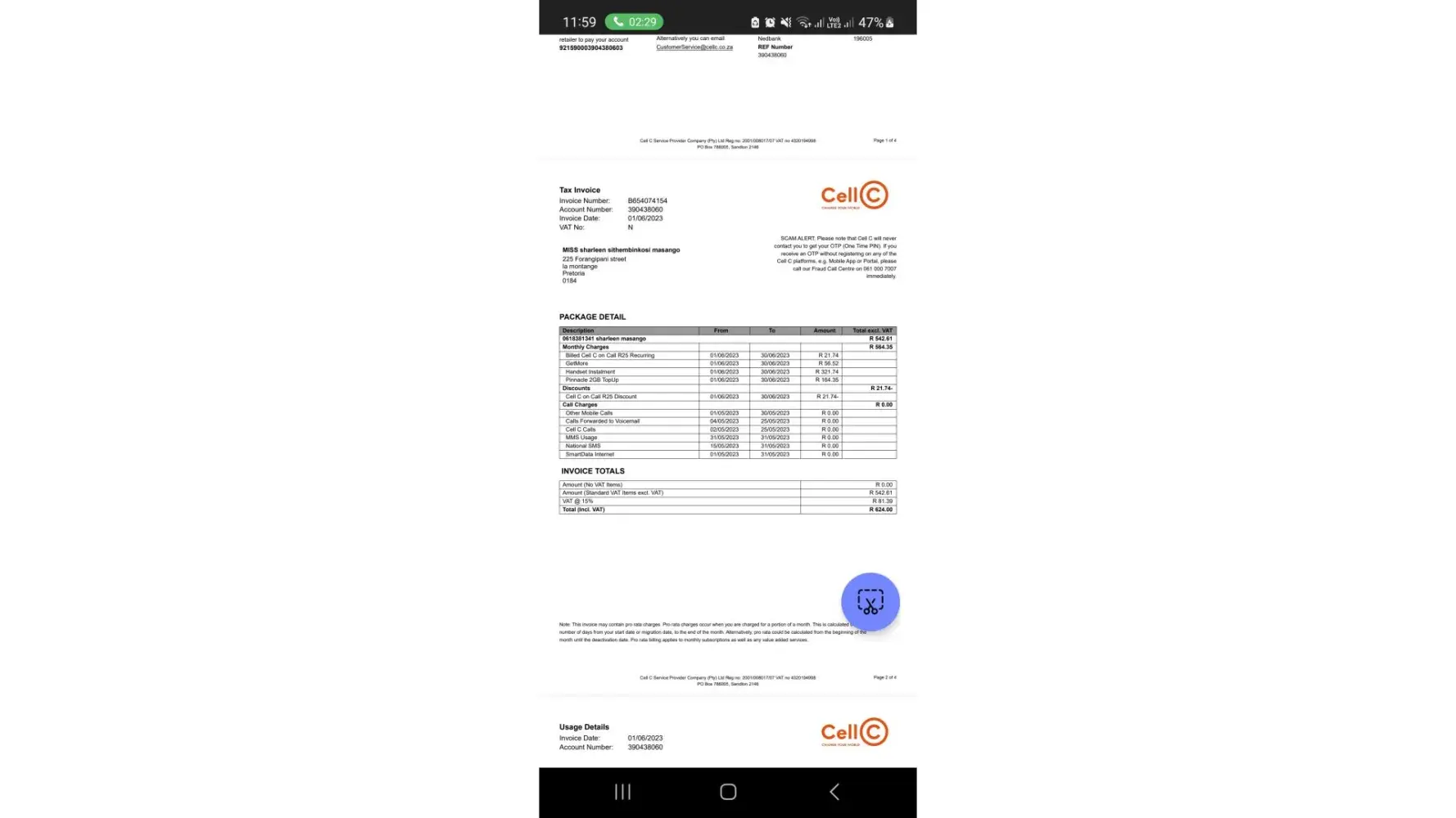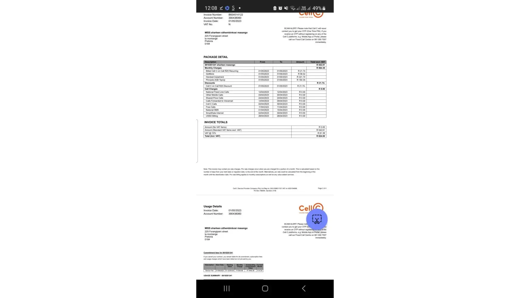 The one from Cell C with a statement where R2292 was added s well as R70 for not honoring payment arrangement, but I did keep to arrangement payment was made on the 31st, so new balance of R2871.