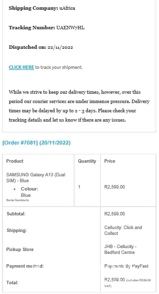On Sunday 20 November I checked your website and found a special on a Samsung A13. I didn't want to wait for delivery so I popped into my nearest branch, Cellucity Bedford Centre.