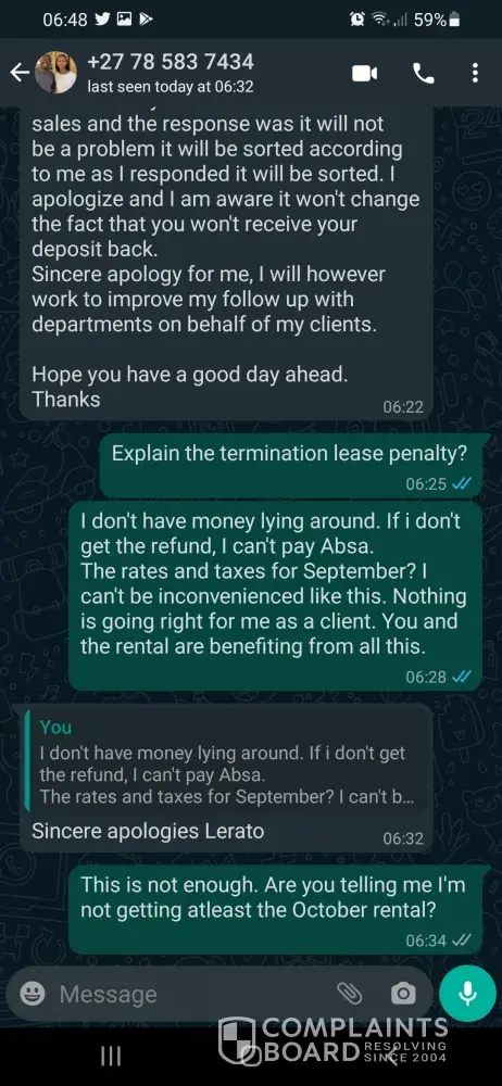 My problem now is with how I feel Hanco Benade misled me in terms of the lease signing. At first he offered 50% off first rent, no admin fee, free 100 MB wifi (t&c's applicable), R7300 deposit. At first I made a huge misunderstanding and did not note the R 7300 deposit part and I immediately paid R2500 to secure the unit since this deal was so good. Later when I went to sign after paying the ‘remaining' R1 150 he brought it to my attention that I needed to also pay R7 300 deposit. I explained I had no money at that point I honestly missed the part of the deposit cause if it were so, I would have budgeted for and not leave the place I was living in mid month to secure that one, meaning I had to also pay prorata rent where I stayed. He advised that I should pay 50% of the deposit (laybye) atleast to be able to move in and I committed to paying the remainder today, 13 September 2019. Based on this I signed the contract and amended lease period from 12 to 6 months and he told me to pay it by Monday 2 September before 12 to avoid losing the offer and I did just that. To my surprise yesterday I received a statement that says I owe R14 600 and some cents. This statement includes rental for October which I agree with and not reputing but also noticed that the 50% off first rent wasn't effected and I needed to pay it. My initial reaction was to call Hanco, he was not available and was told by the office he was offsick. I called Elsje the lady that sent me the statement and she was on site but another lady was also helpful. I also sent an email reputing the statement highlighting the issue about 50% off first rent