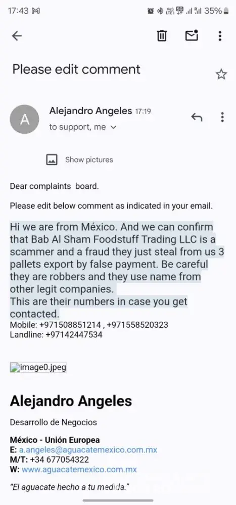 He should refer the name Bab Alsham Foodstuff Trading LLC instead of Bab Alshamas Foodstuff Trading LLC.