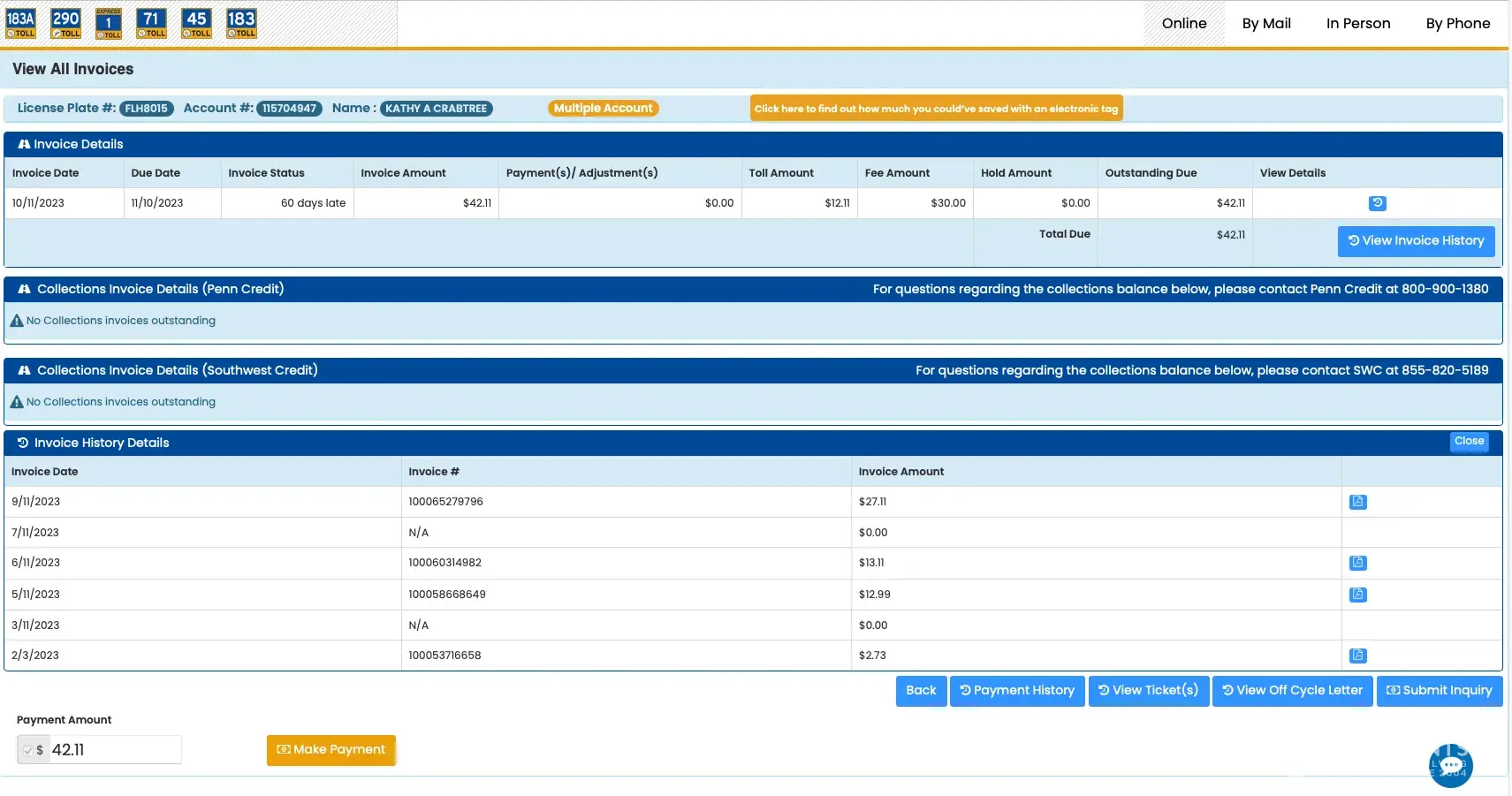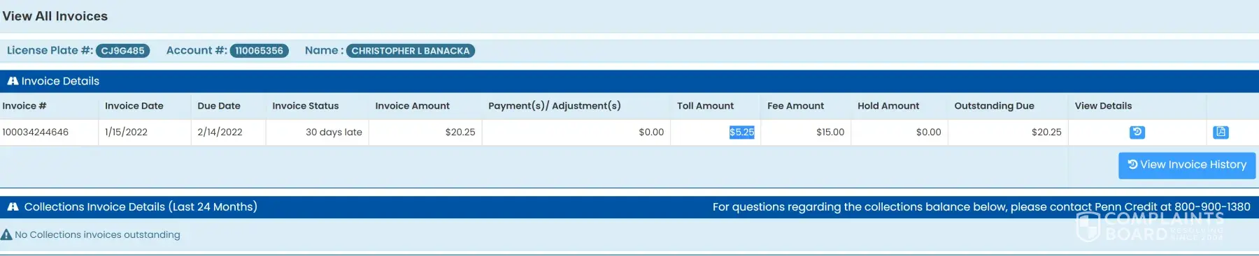 Starting with License plate number FLH8015. I’ve attached the only two invoices that were used by your toll road. The one in question is # [protected] which is also #[protected]. This is also attached. The original invoice was paid on June 16, which your department acknowledged after stating no. I’ve also attached copy of payment to my bank which is not really necessary but why not. So since you create invoices for late charges on top of an already invoice your departments did not properly research correctly when I called in over a month ago. But instead you all sent an invoice for late charges but it was paid. How on earth if the invoice # [protected] was paid but probably under another invoice can you all perform proper accounting in an event like this. Horrible accounting practice. Regardless, I’ve shown you enough to show that the $13.11 was paid on time and that the other invoice does not have merit. Please remove the charges and void invoice #[protected].
