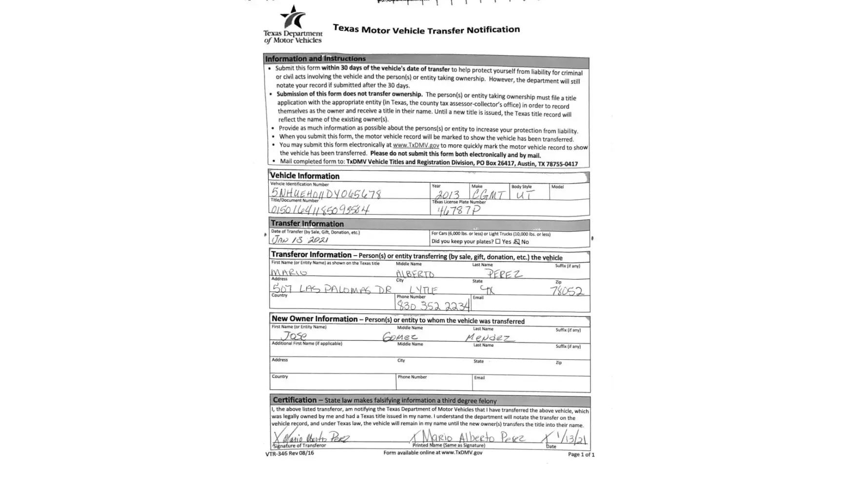 I completed the Texas Motor Vehicle Transfer Notification form. I have a copy for your review.
