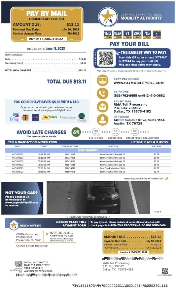 i have a bill for $3.94. i accidently threw away 2 weeks ago, i have owned my car for 10 years, i do not own the car in the picture, it's a different make and color,(in picture car is a kia, black or very dark blue, wrong on both counts) and why did you blur out the plate, that would prove you wrong? and me right . been only 12 days and i'm being charged 1 month late fees of $14.00, also i have not been in texas in over a year, i have never been in austin. if i have to i'll go to court, this will be an easy win.. why aren't these people in jail!(after reading about 40 complaints)[protected]