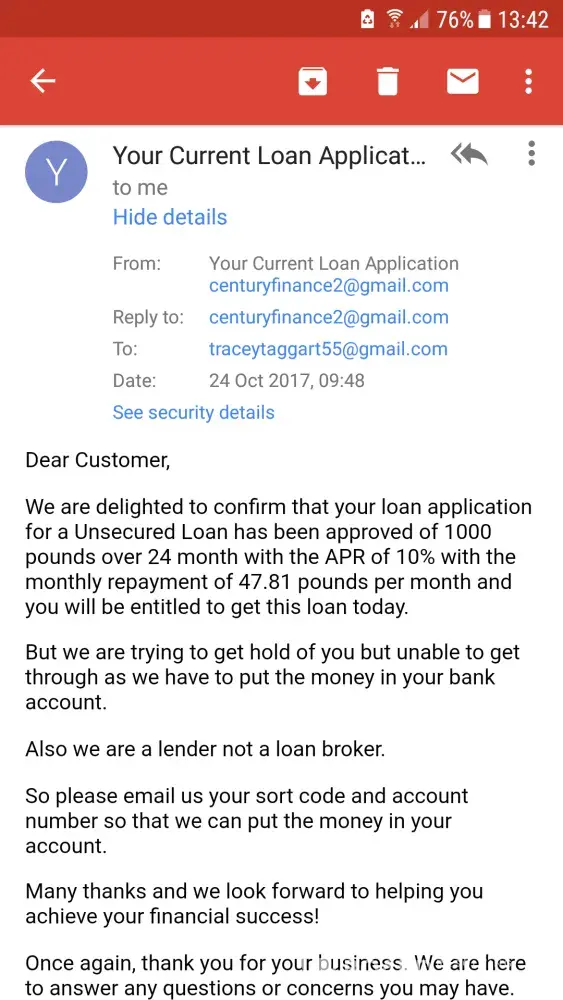 I put n 4 a loan of £1000 n have had emails from which is ment 2 b century finance, but when I read up on century finance it states that if their email address IS, [protected]@gmail.com