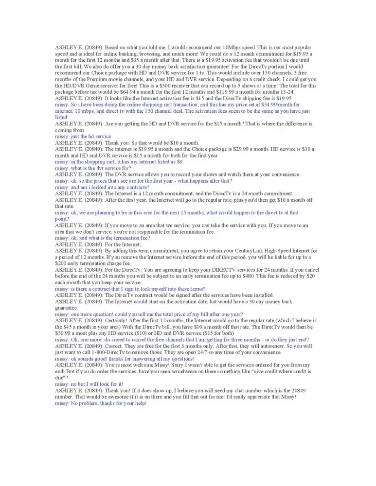 In October 2013, I was searching for Internet providers and comparing prices. I went to centurylink.com and started an online chat with one of their service representatives. The representative told me that I would pay $19.95/month for Internet and $29.99/month for Direct TV services, which would be setup and billed each month on my Century Link bill. She told me the total amount of my monthly bill would be $49.94 plus nominal taxes and fees.